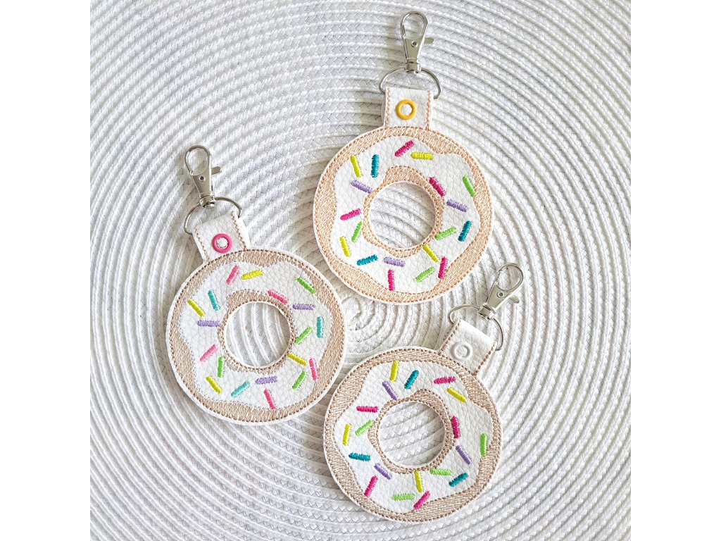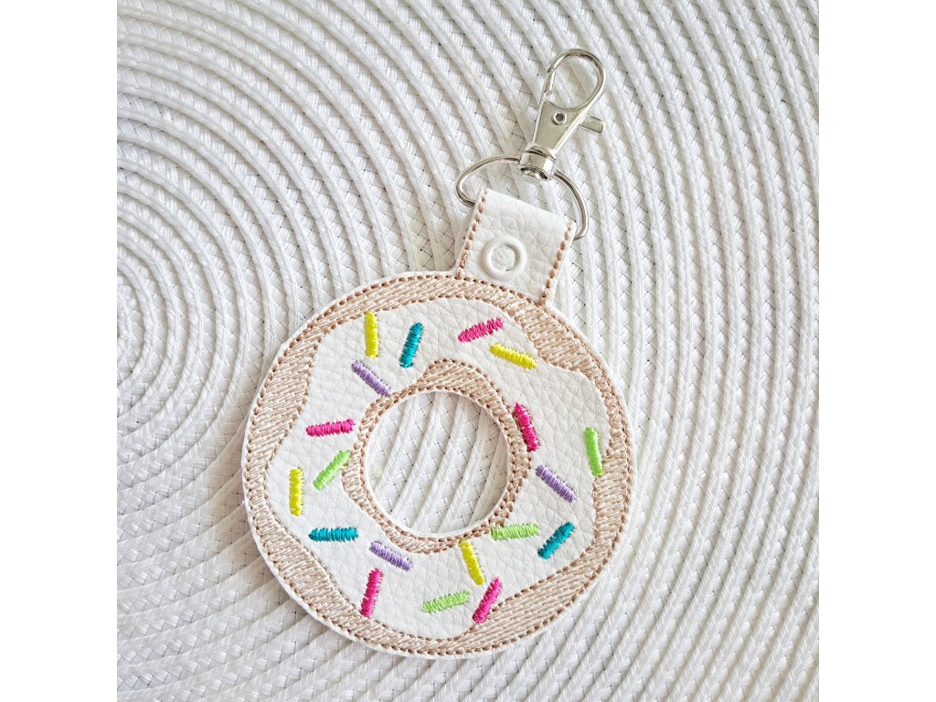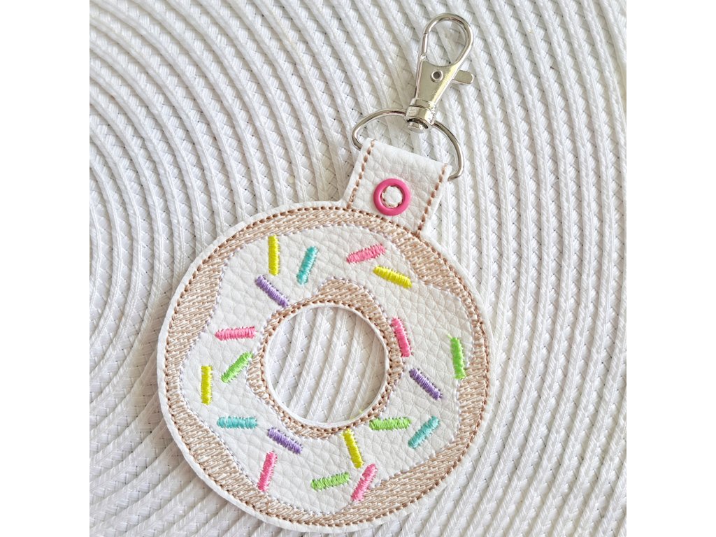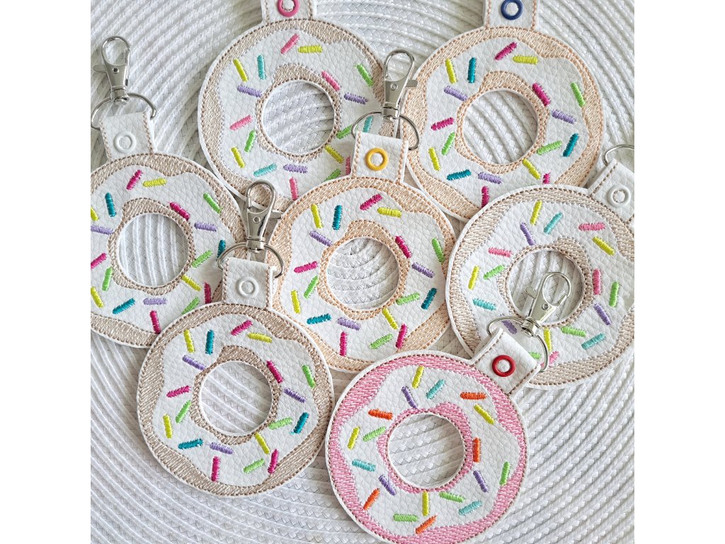 Kľúčenka je doplnená o karabinku a cvočky. Farba konfiet na donutke sa môže od fotky líšiť.