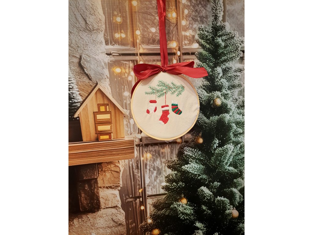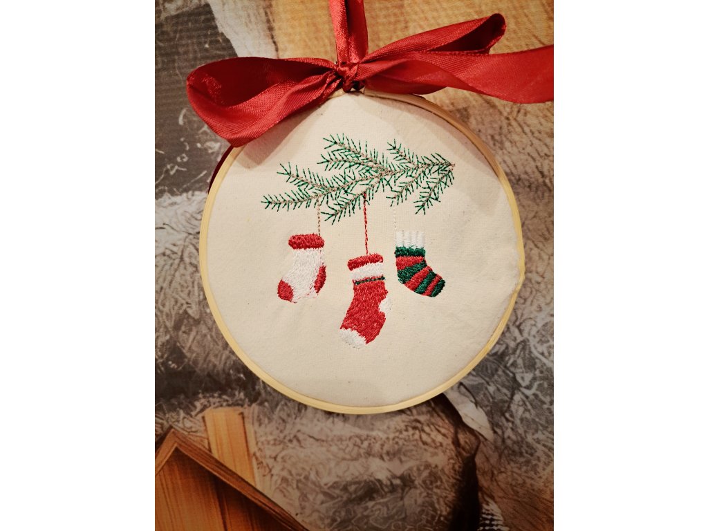 Vyšívaná Vianočná dekorácia konárik s ponožtičkami, ktorá privodí milú atmosféru aj do každej izbičky. Alebo na dvere. Výšivka je uchytená v drevenom rámčeku,ktorý je súčasťou.