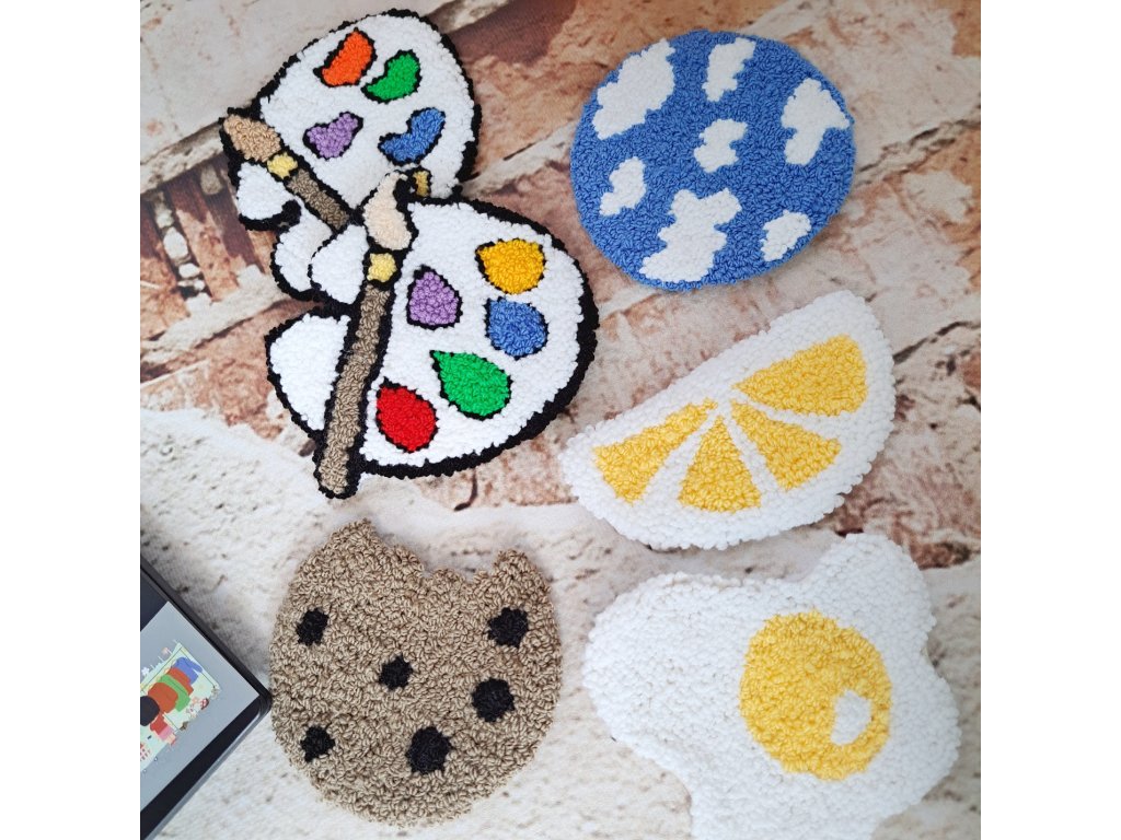 Podložka je od začiatku až po samotný koniec nami ručne vyrábaná. Použitá je technika dutou ihlou a vlnou. Podložky sú cca 10 cm. Uvádzame cca 10cm preto, lebo nie všetky sú pravidelného tvaru. Ako napr. paletka, keksík, polovicný citrón... :-)