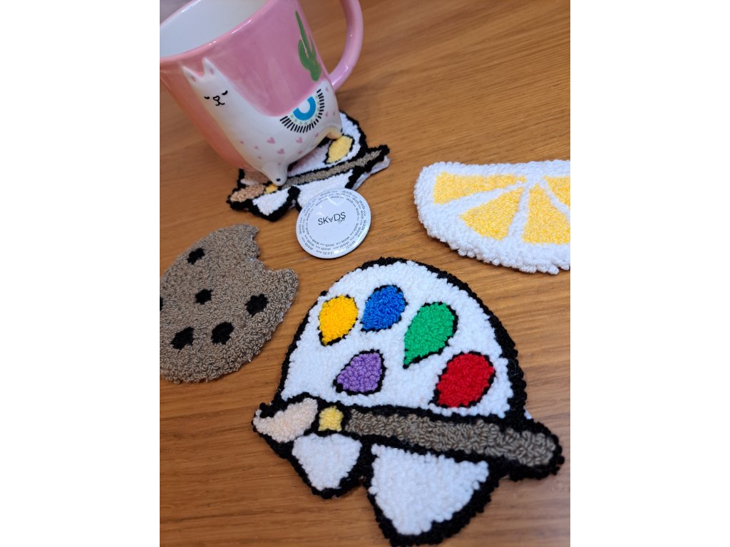 Podložka je od začiatku až po samotný koniec nami ručne vyrábaná. Použitá je technika dutou ihlou a vlnou. Podložky sú cca 10 cm. Uvádzame cca 10cm preto, lebo nie všetky sú pravidelného tvaru. Ako napr. paletka, keksík, polovicný citrón... :-)