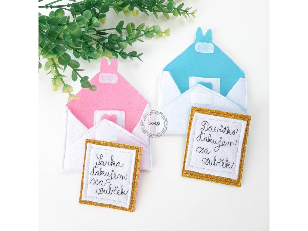 Dieťatko dá zubček do obálky, v ktorej je malá kapsička na zubček, s označením zubčeka. V noci ho jednoducho vymeníte za korunku ( nie je súčasť balenia) a pridáte list od zubkovej víly :-)